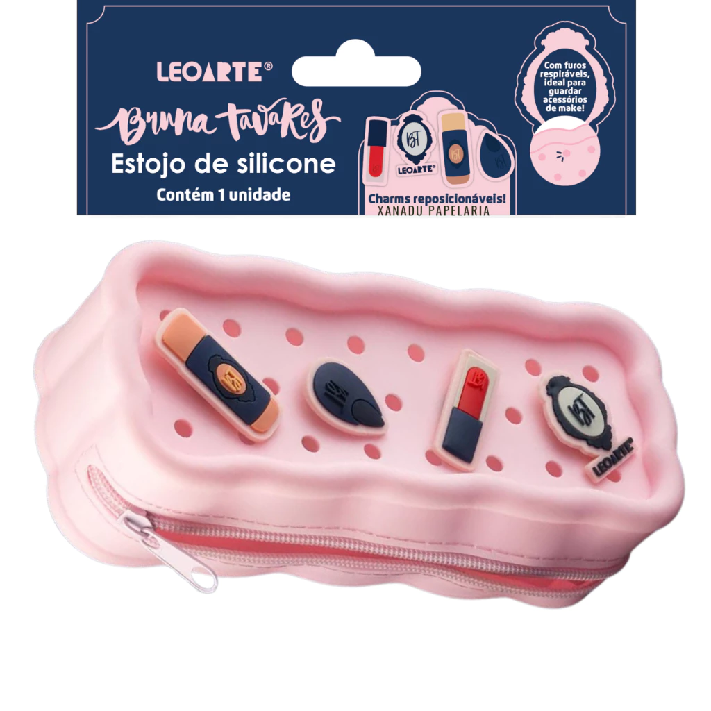 Além de deixar o material escolar organizado, o Estojo de Silicone Com Pins Bruna Tavares LeoArte se propõe a guardar também itens de maquiagem.