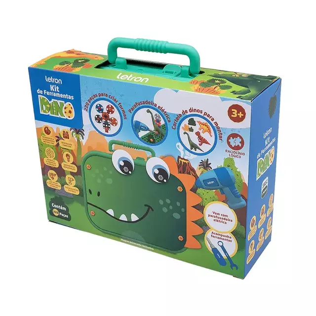 Com o Kit de Ferramentas Dino Caixa com 228 Peças Letron, a criança brinca e aprende com o fascinante universo dos dinossauros, desenvolvendo a imaginação e diversos estímulos sensoriais e cognitivos.